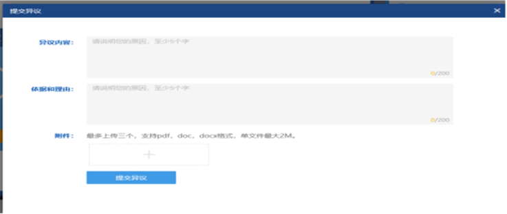 2、在弹出的提交异议对话框中,编辑异议内容等并点击【提交异议】按钮。如图:
