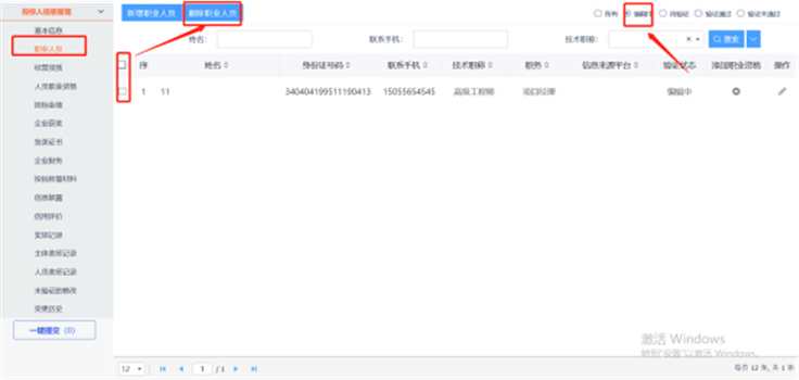 2、点击【投标人信息管理】—【职业人员】,查询是否已录入人员。如未录入人员,请录入后再进行挑选。如图: