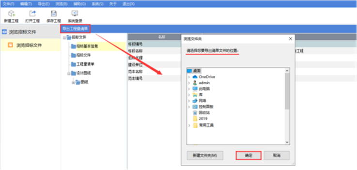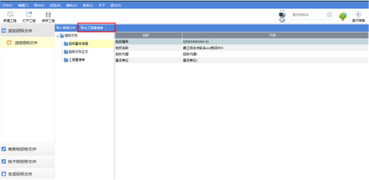 点击投标工程文件左侧【浏览招标文件】,通过【导出工程量清单】将招标清单导出到指定路径。