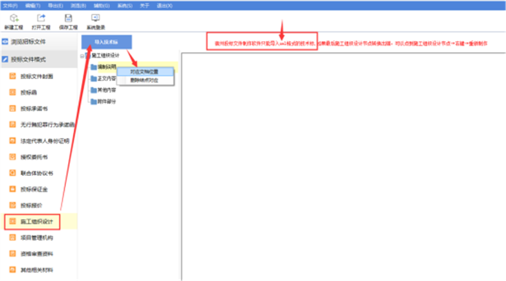 注意:此处导入的后缀名为.xml的技术标文件,是由专门的技术标软件,接收评标办法新建并编制而成。