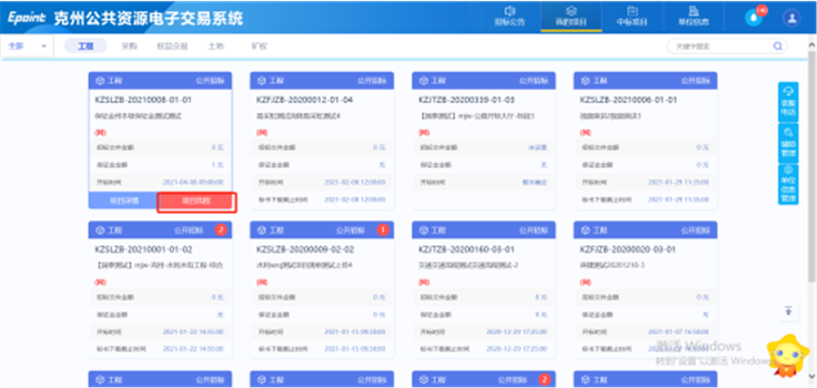 1、请登录克州电子交易平台会员端,在【我的项目】中找到对应项目,点击【项目流程】,进入项目流程页面。如图: