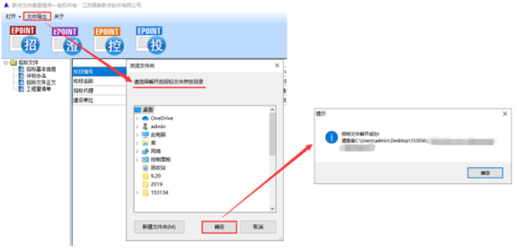 第二步、点击左上角【文件导出】按钮,可将招标相关文件导出到指定路径,导出成功后软件会提示“招标文件解开成功!”。