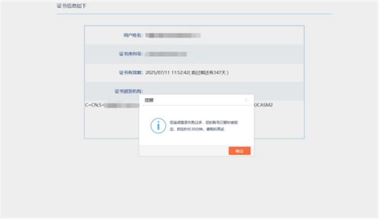 问题2:ca登录提示:“您连续登录失败过多,您的账号已暂时被锁定,锁定时长*分钟。请稍后再试”如何处理?
